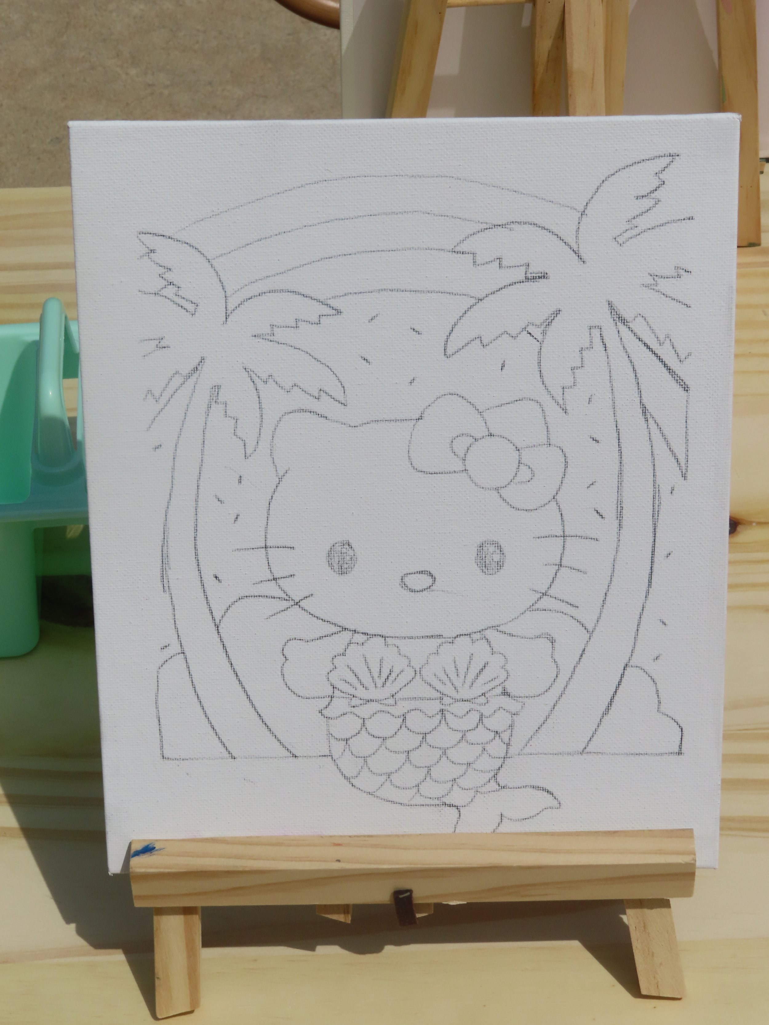 Using graphite paper and the coloring book page, you are able to transfer the perfect picture over on to the canvas, perfect for themed parties. For our party, Hello Kitty was the theme. Using a coloring book with this theme, we made a unique party favor for each child attending.
