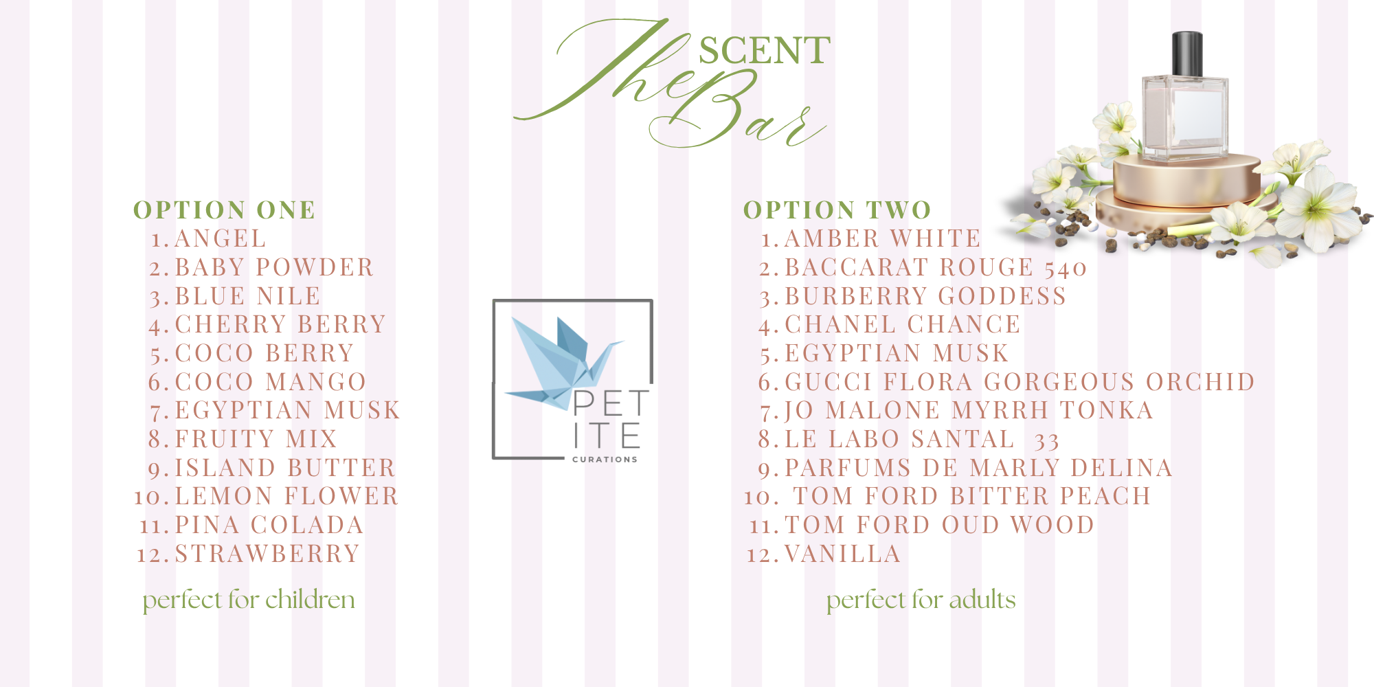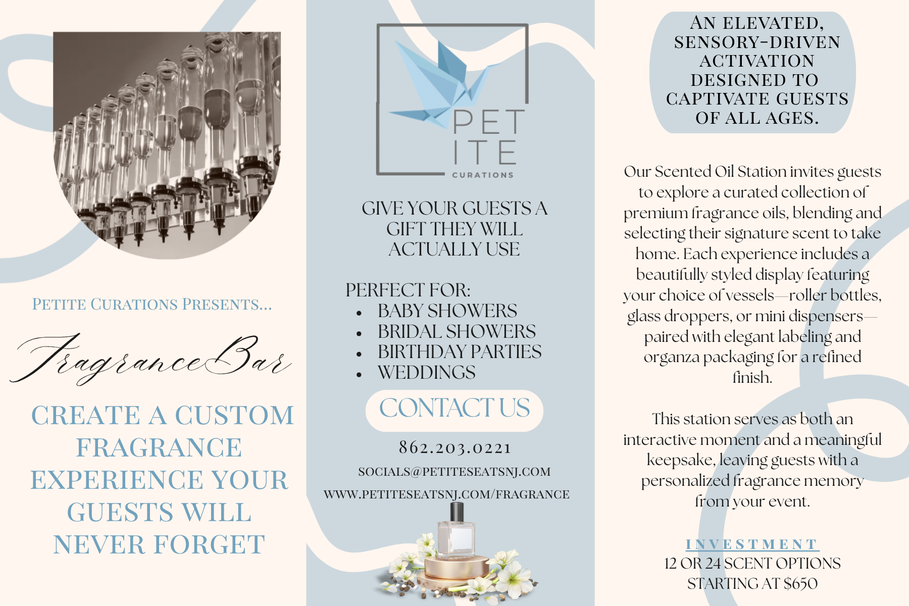 OUR FRAGRANCE BAR is a subsidy of the Petite Seats brand, Petite Curation. Whether it’s a birthday party, bridal shower, corporate event, christening, wedding or high tea we can make your special event the talk of the party with personalized activations. We love to hear from our customers. Please drop us a note and we will get back to you as soon as possible. You may email us at socials@petiteseatsnj.com